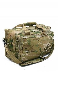 A medium sized travel bag by Pantac with 4 compartments. 1 large primary space for clothing or skirmish gear, zip closed pouches on the left and right face of the bag, with an open pouch.